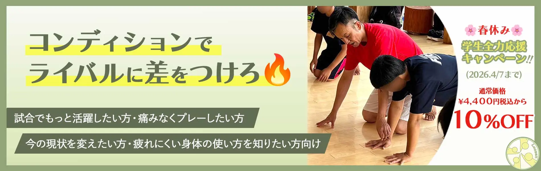 | スポーツ学生応援コース 初回体験 2回目以降 | 70〜90分 60分 | 春休みキャンペーン10%OFF 3,960円 3,960円 |